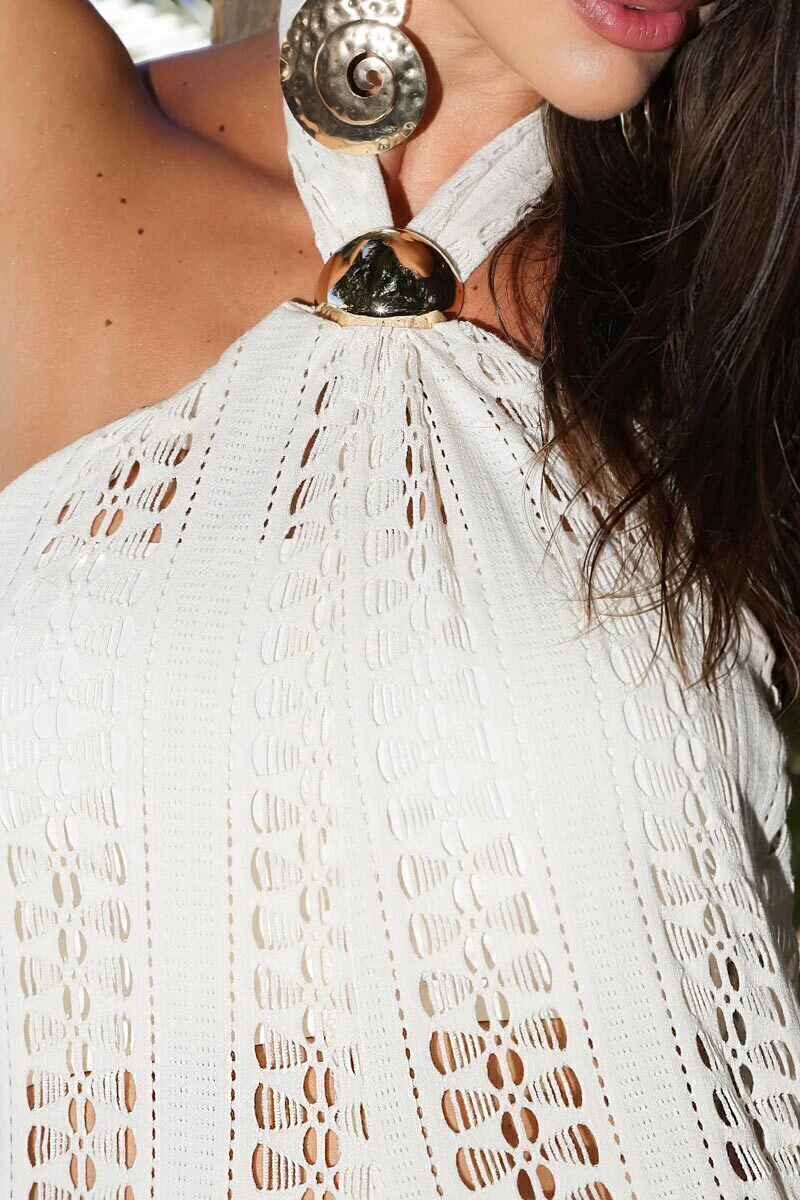 Com caimento fluido e toque artesanal refinado, esta Túnica em crochê p exibe sofisticação e ousadia em perfeita harmonia. A fenda frontal aliada ao decote halter com ferragem metalizada transmite um visual marcante e atual.